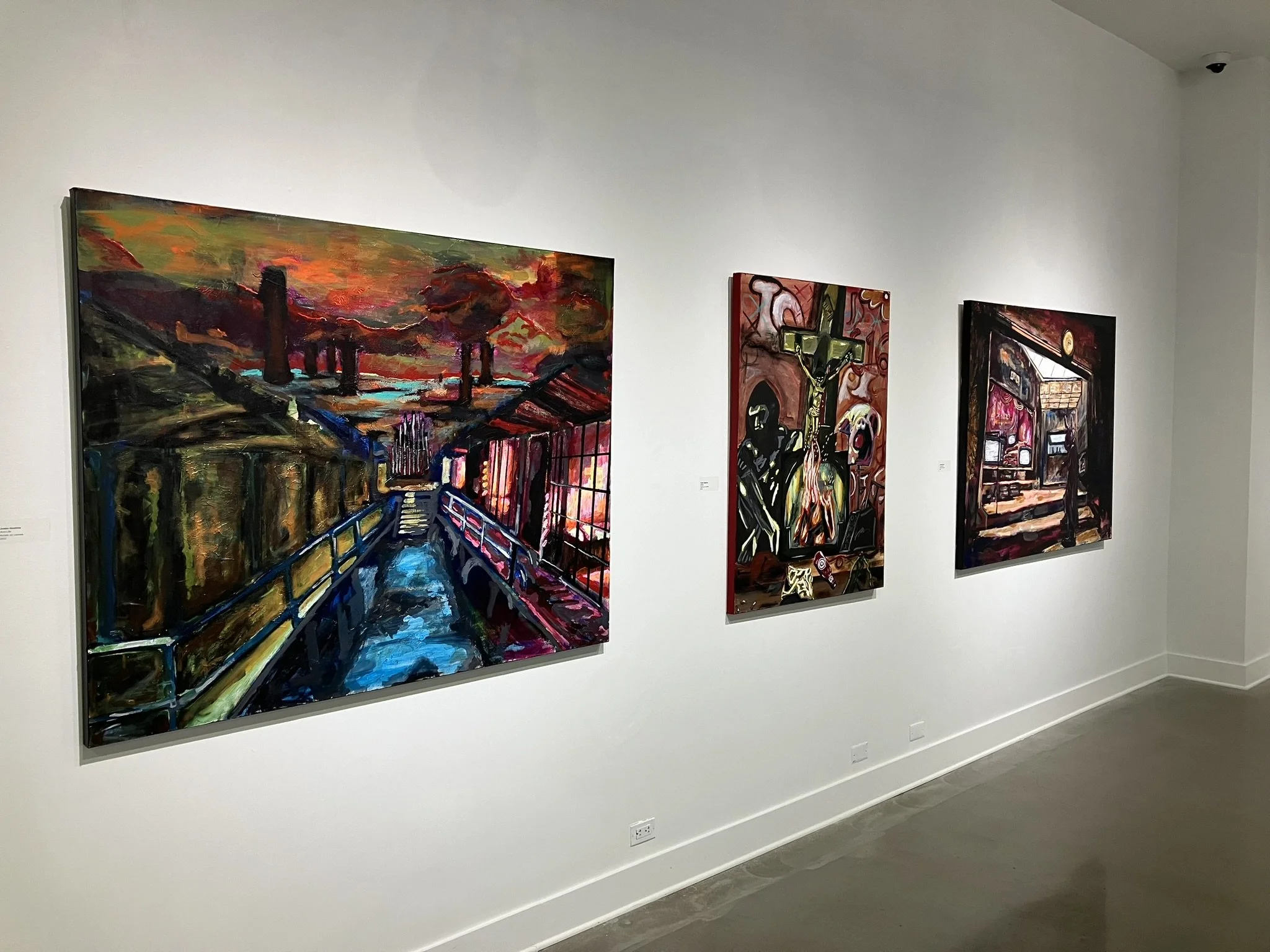 My large-scale paintings depict conceptual derelict environments to convey salvation and damnation. I paint imagined spaces based on photo references from music videos, films, video games, and religious imagery to visualize uncertainty and grief. My visual narratives imply trials and tribulations of an expedition to an uncertain destination.